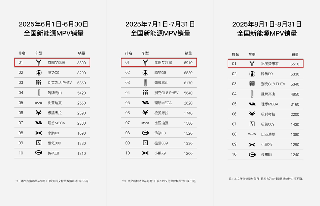 在高端新能源MPV领域,岚图梦想家已经成为岚图汽车的销量担当,自2023年起,岚图梦想家销量多月位居新能源MPV品类月度领先。2025年6月至8月,岚图梦想家销量连续三个月领跑全国新能源MPV。