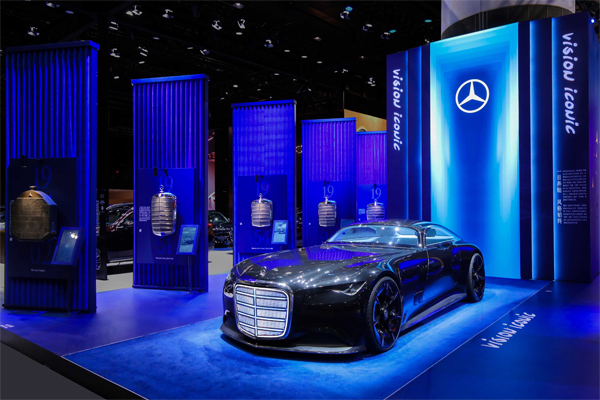 Vision Iconic概念车则以经典复古元素与现代数字科技融合,重构品牌设计语言:全新盾形格栅从历代经典S级汲取灵感,搭配镀铬框架与数字化照明;内饰采用装饰艺术风格与珍珠母镶嵌工艺,“齐柏林”悬浮玻璃仪表串联经典与现代;太阳能涂层、神经形态计算、L4级自动驾驶等科技的植入,既展现对未来出行的探索,也通过与10款百年经典格栅的同框,强化品牌设计传承的厚度。