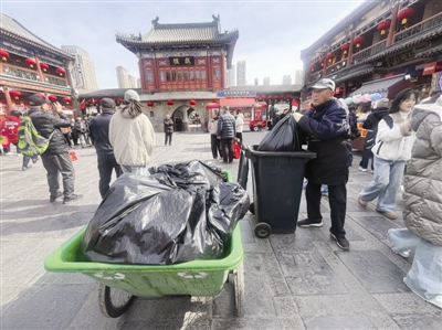 广场一侧,另一位环卫人员正忙着给大垃圾桶更换垃圾袋。他告诉记者,从早上上岗到现在,自己已经清运了9车垃圾,每车垃圾都要送到垃圾转运站。“游客多,吃小吃的人也多,垃圾产生快,转一圈回来,刚清空的垃圾桶就接近满了,必须及时更换,不能让垃圾堆积。”他一边说着,一边加快了手中的动作。