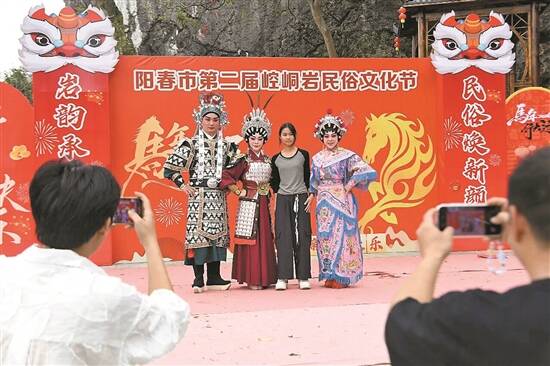 在阳春崆峒岩景区,古老而浪漫的打铁花每晚在夜空绽放。滚烫的铁水被击打向高空,瞬间化作漫天星光,与地上的笑脸交相辉映。白天,游客争相与粤剧演员合影,演员用唱腔与台下观众互动,醒狮表演精彩连连。