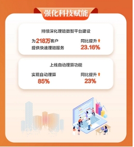 比如阳光财险在车险理赔方面,整合内外部资源,开发并上线理赔数智平台,集成智能调度、送修管控、修理伙伴、增值服务,2024年共为218万客户提供快速理赔服务,同比提升23.16%;同时上线自动理算功能,自动理赔率达85%。