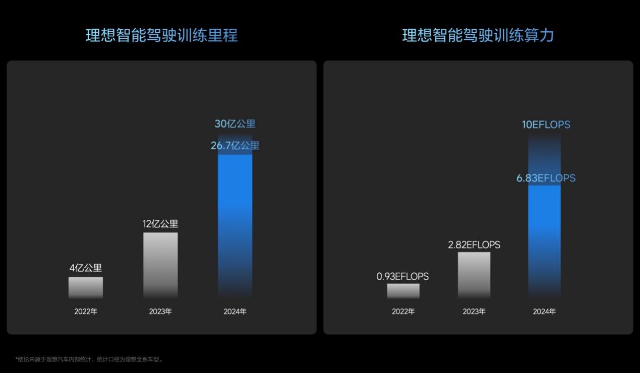 得益于双系统+世界模型的研发体系,理想智能驾驶AI模型的迭代效率极为迅速。在短短三个月的时间内,就成功迭代了30个版本。截至目前,理想汽车智能驾驶训练数据已经达到30亿公里。同时,理想汽车整体的算力也实现了大幅提升,目前已达到10EFLOPS。此外,智能驾驶数据训练量也持续增长,已经达到500万cips。