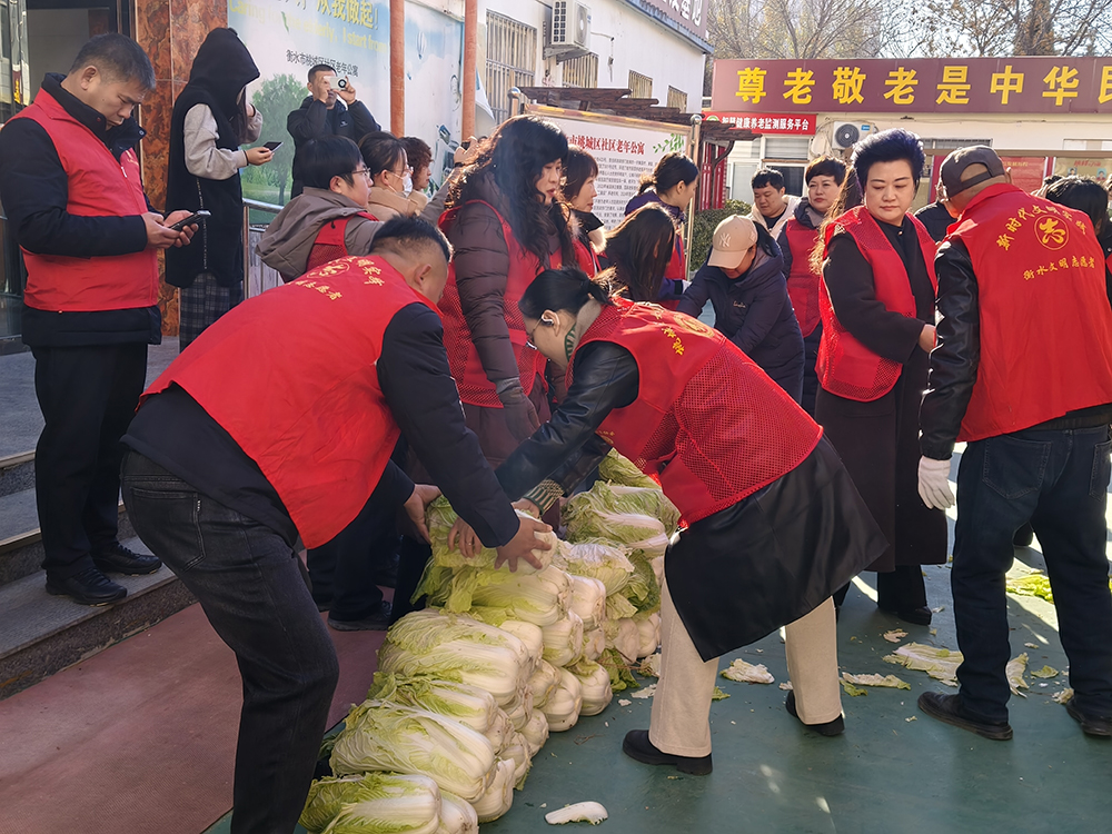 活动现场,志愿者们一边热情地将白菜打包好递到环卫工人、外卖配送员、社区老人的手中,一边与他们亲切交谈,关切地询问日常冷暖。现场笑声融融,温情流动。随后,爱心队伍继续行动,将新鲜白菜送至桃城区社区老年公寓,让这份暖意延续到更多需要关爱的群体。