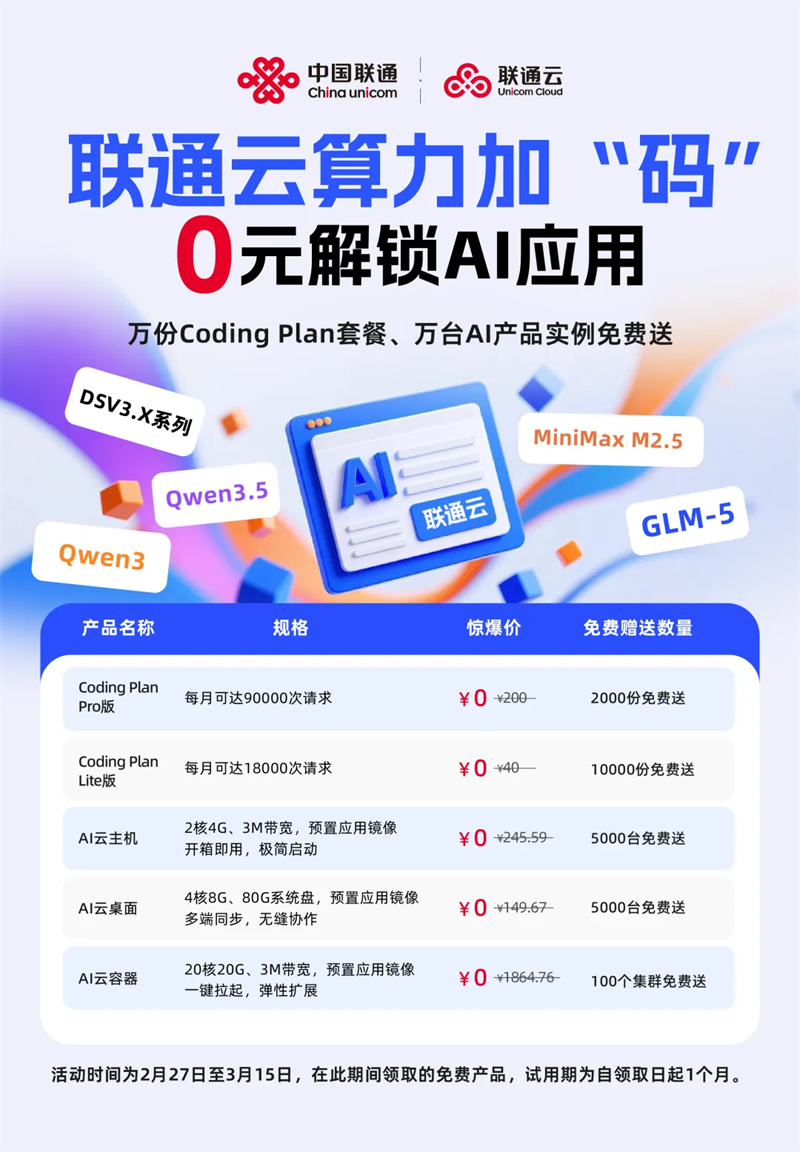 开工焕新季,联通云重磅推出Coding Plan套餐,全面上线包括GLM-5、MiniMax M2.5、Qwen3.5、DSV3.X系列、Qwen3在内的五大顶流模型,用户可在OpenCode、Claude Code、OpenClaw、CoPaw四大主流AI工具上随心选,打破模型与工具的绑定壁垒,更有免费算力随心用,让使用者一键实现“模型自由+工具自由+算力自由”三重红利。